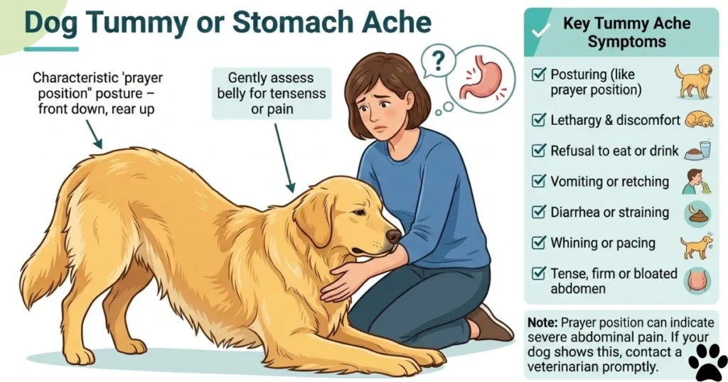 Signs your dog has tummy ache: prayer position (front legs stretched, rear legs elevated), hunched posture, decreased appetite, restlessness, seeking isolation, looking at the belly repeatedly, reluctance to lie down, whining, belly rumbling, and gentle touch causes flinching.